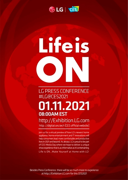 온라인으로 열리는 프레스 콘퍼런스는 미국 동부시각 1월 11일 오전 8시부터 30분간 진행되며 CES 홈페이지, LG전자 온라인 전시 사이트, LG전자 글로벌 유튜브 채널에서 생중계된다.