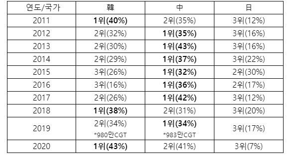 2020년 전세계 누계 발주량은 1924만CGT로 2019년 2910만CGT에서 33% 감소했다. 이런 악조건 속에서 한국 조선업계가 수주 점유율 1등을 기록했기 때문에 의미가 크다.