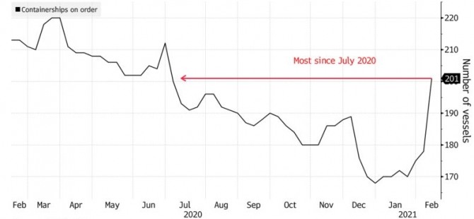 또 영국 금융정보업체 IHS마킷 자료에 따르면 전 세계 선사의 누적 발주 물량은 지난해 말까지 꾸준히 감소했다. 그러나 이런 분위기는 올해 초부터 반전됐으며 총 23척의 새 컨테이너선이 발주돼 누적 발주 물량 201척을 기록하고 있다.