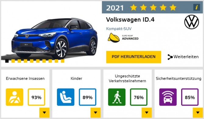 이는 지난해 10월 ID.3에 이은 ID.4의 최고 등급 획득으로 ID. 시리즈의 우수한 안전성을 공고히 했다.