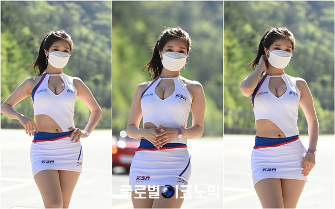 레이싱모델 윤지는 이날 신종 코로나바이러스 감염증(코로나19) 예방을 위해 마스크를 착용하고 그리드워크 이벤트를 마친 후 복귀하는 길에 섹시한 포즈를 취하며 모델 포스를 뽐냈다.