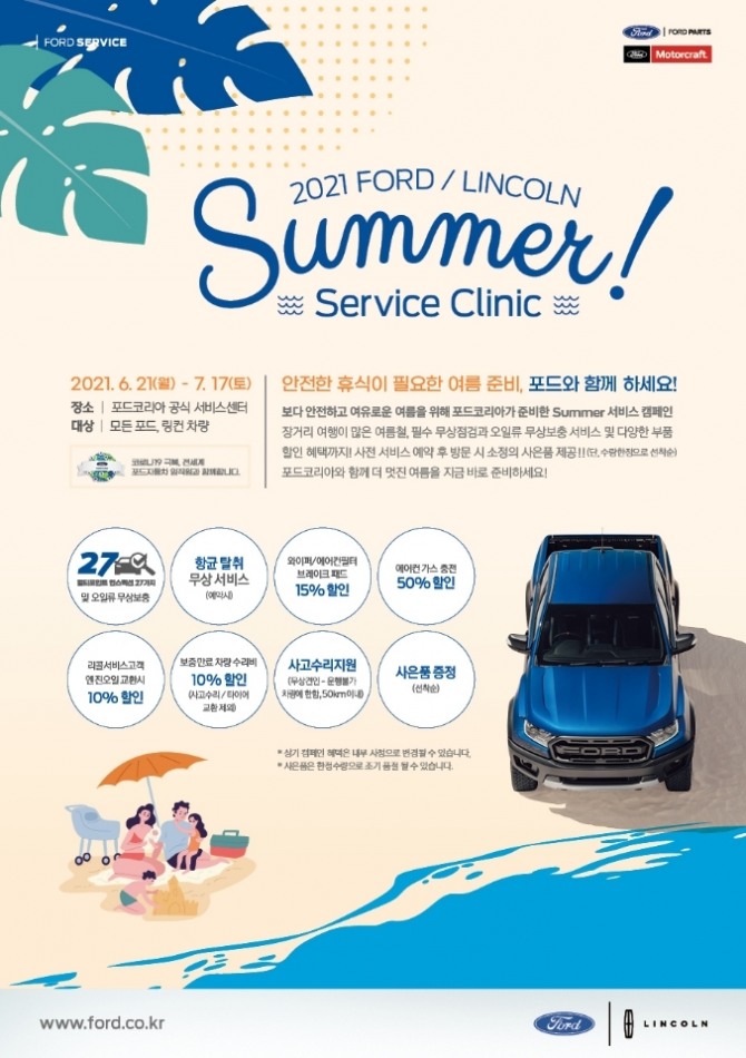 이미지 확대보기이번 캠페인은 전국 포드·링컨 서비스센터에서 포드와 링컨 전 차종을 대상으로 진행되며 포드 전문 테크니션의 27가지 멀티포인트 무상 점검과 각종 오일류 무상 보충 서비스가 제공된다.