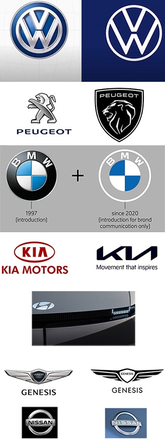 이처럼 전세계 자동차 제조사들이 선보이는 새 로고의 공통점은 기존 3D(3차원) 입체감이 있던 로고를 최대한 단순하고 간결하게 2D로 변경했다는 점이다.