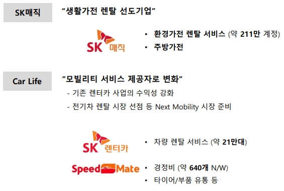 이미지 확대보기SK네트웍스의 사업부문은 가전 렌탈(SK매직), 차량 렌탈(Car Life), 핸드폰 기기 판매(정보 통신), 상사업 등으로 분류 된다.