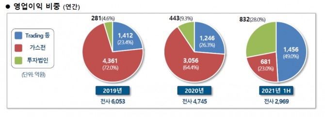 포스코인터내셔널의 전체 영업이익에서 차지하는 비중 또한 2019년 4.6%에서 2020년 9.3%, 올 상반기 28%로 상승했다. 즉 포스코인터내셔널의 사업이 다변화 되고 있고 이를 통해 충분한 영업이익을 이끌어 내고 있다는 말이다.