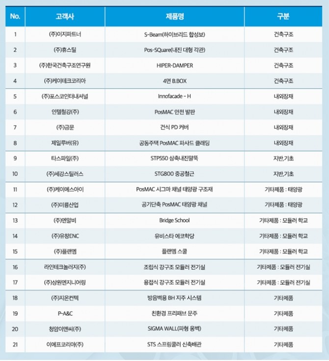 고내식강을 적용해 내구성을 대폭 향상한 안전발판과 소화전함도 인증 제품에 포함됐으며, 태양광발전 구조체 제품 2개도 이번에 추가로 인증을 받으면서 태양광발전 관련 이노빌트 제품은 총 9개가 됐다.