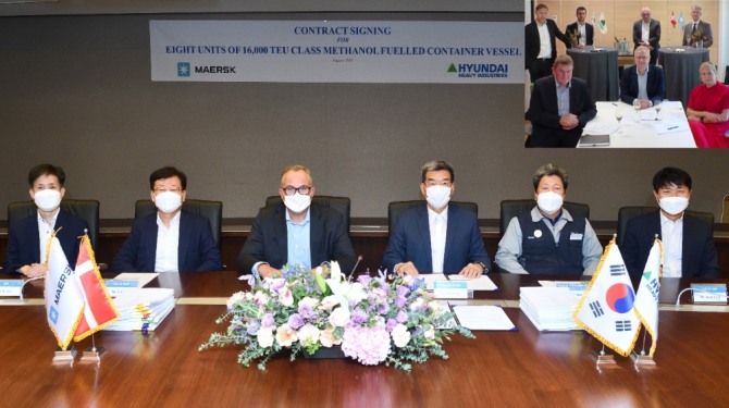 한국조선해양은 최근 덴마크 선사 머스크와 1만6000TEU 급 메탄올 추진 초대형 컨테이너선 8척에 대한 건조 계약을 체결했다고 25일 밝혔다. 총 수주 금액은 1조6474억 원이다.