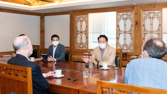 8일 SK그룹에 따르면 최 회장은 7일 서울 종로구 SK서린사옥에서 SK E&S가 지난달 지분 95%를 확보한 미국 그리드 솔루션 기업 KCE의 제프 비숍(Jeff Bishop) 최고경영자(CEO)를 만나 에너지 솔루션 시장에서 협력 방안 등을 모색했다.