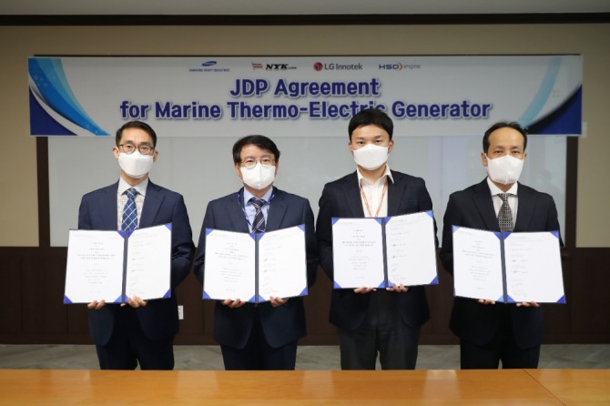 삼성중공업은 LG이노텍과 4년 여 간의 연구 노력 끝에 지난 3월 진동에 강하고 발전 성능을 높인 나노 구조 다결정 소재를 활용한 열전발전 모듈·시스템 개발에 성공하고 프랑스 선급 BV로부터 기술 인증을 획득했다.