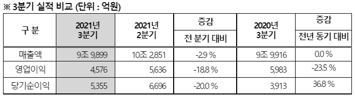 매출액 전년 동기와 비슷한 9조 9899억 원...영업이익 23.5% 감소한 4576억원