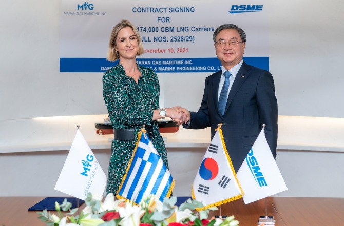 이미지 확대보기대우조선해양은 그리스 최대 선사 안젤리쿠시스 그룹 산하 마란가스(Maran Gas Maritime)로부터 LNG운반선 2척을 수주했다고 11일 밝혔다.