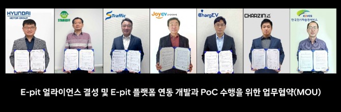 이미지 확대보기현대차그룹은 18일 스타코프, 에스트래픽, 제주전기자동차서비스, 차지비, 차지인, 한국전기차충전서비스 등 국내 충전사업자 6개 업체와 ‘E-pit' 얼라이언스 결성과 E-pit 플랫폼 관련 업무협약(MOU)을 각각 체결했다고 밝혔다.