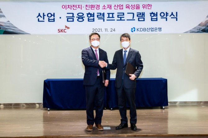 SKC와 산업은행은 24일 전북 정읍시 SK넥실리스 정읍공장에서 ‘2차전지·친환경 소재 산업 육성을 위한 산업·금융협력 프로그램 협약’을 체결했다. 이번 협약에서 산업은행은 앞으로 5년 간 SKC의 2차전지·친환경 소재 연구·개발·투자와 관련해 1조5000억 원 규모의 중장기 금융협력을 진행키로 했다.