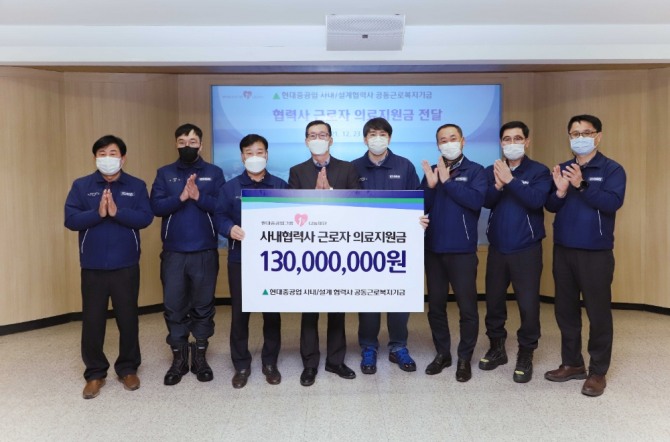 이미지 확대보기현대중공업 사내협력사들이 설립한 ‘현대중공업 사내협력사 공동근로복지기금’은 23일 현대중공업 울산 본사 문화관에서 ‘협력사 근로자 의료지원금 전달식’을 갖고, 사내협력사 직원 130명에게 100만 원씩 총 1억3000만 원의 지원금을 전달했다고 밝혔다.