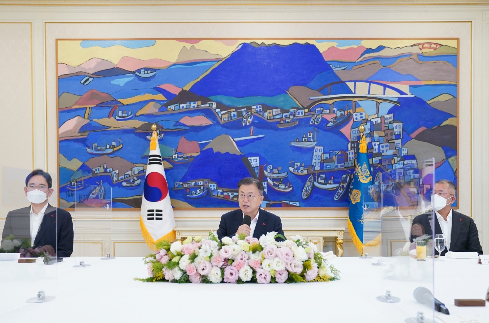 이재용 삼성전자 부회장, 정의선 현대자동차그룹 회장, 최태원 SK주식회사 회장, 구광모 (주)LG 회장, 최정우 포스코그룹 회장, 구현모 KT 대표이사 등 6개 대기업 총수들이 한 자리에 모였다.