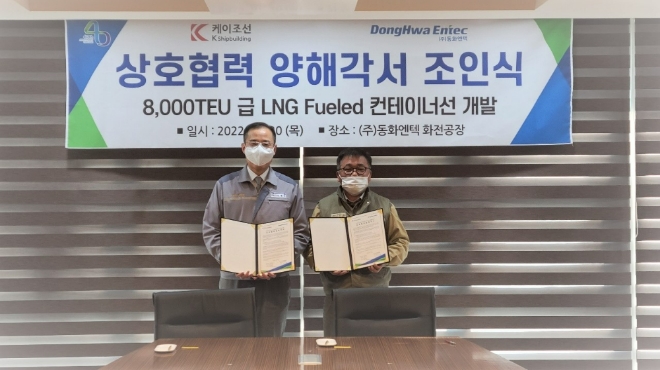 MOU를 통해 동화엔텍은 LNG FGSS(LNG 연료 공급 시스템) 엔지니어링과 실선 적용을 담당한다. 케이조선은 8000TEU(1TEU는 20피트 길이 컨테이너)급 컨테이너 선박의 기본설계 적합성을 검증하는 ‘선급의 기본승인(AIP)’ 획득을 추진 중이다.