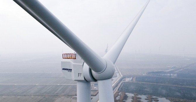 이미지 확대보기27일 두산중공업은 전라남도 영광군 백수읍에 위치한 국가풍력실증센터에 8MW 해상풍력발전기 시제품 설치를 완료했다고 밝혔다. 이달 말 시운전에 들어가 오는 6월 국제인증을 취득하고 상용화에 나설 예정이다.