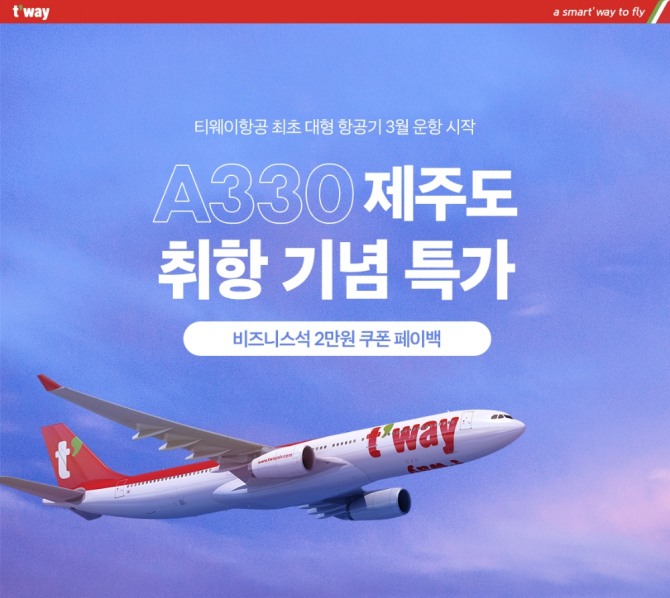 A330-300 기종은 22일부터 김포~제주 노선에 투입돼 매일 6편(왕복 3회) 운항을 이어갈 계획이다. 이를 기념한 특가 프로모션이 티웨이항공 홈페이지와 모바일 앱, 웹에서 3월 31일까지 진행된다. 다만 운항 편수는 향후 일정에 따라 조정될 수 있다.