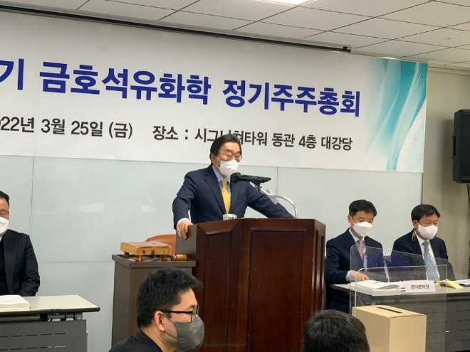 이미지 확대보기금호석유화학은 25일 시그니처 타워에서 제45기 정기주주총회를 개최했다. 오전 9시 시작될 예정이었지만 참석 주주와 의결권 위임, 검표 작업으로 늦어져 오전 10시 30분에 개회했다. 주총 현장에는 약 70여 명의 주주가 직접 참석했다.