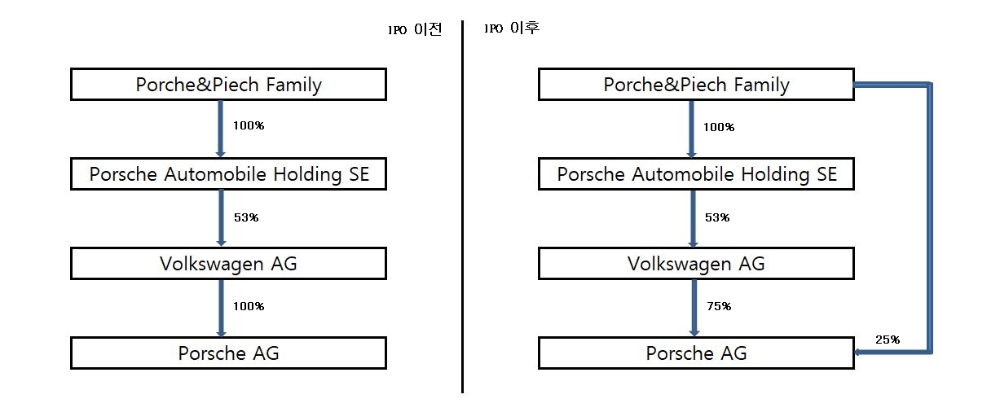 폭스바겐 100%→폭스바겐75%, 포르쉐홀딩스 25%로 지배구조 변경