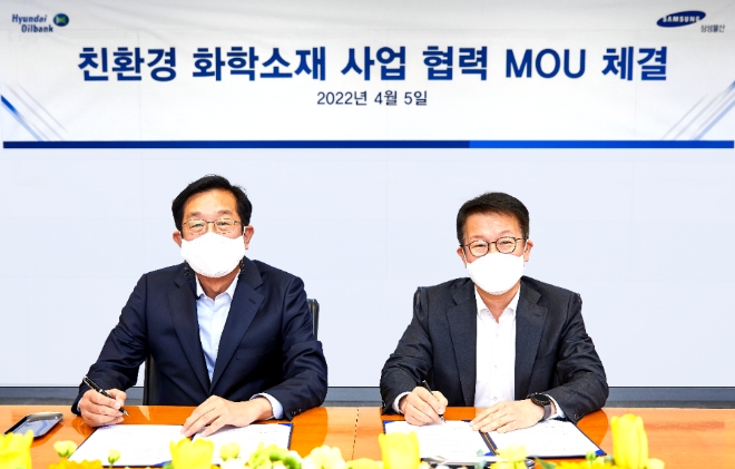 현대오일뱅크와 삼성물산은 5일, 서울 중구 현대오일뱅크 사무소에서 주영민 현대오일뱅크 대표이사와 고정석 삼성물산 대표이사가 참석한 가운데 ‘친환경 화학소재 사업 협력 양해각서’를 체결했다.