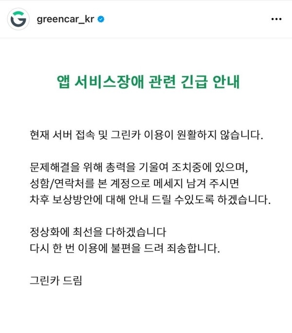 그린카는 오후 2시40분경 인스타그램 계정을 통해 "서버 접속이 원활하지 않다"며 오류 사실을 뒤늦게 공지한 데 이어 6시경 "현시점 이후 불편 상황은 계정에 안내된 구글 닥스 링크를 통해 제출해달라"고 요청했다.