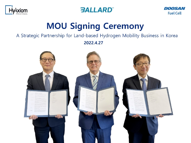이번 협약식에서 두산퓨얼셀과 발라드, 하이엑시엄 등 3사는 모빌리티용 수소연료전지(PEMFC) 시스템 개발과 양산, 수소버스 판매, 수소 및 전기 충전소 공급 등을 위해 협력할 것을 약속했다.