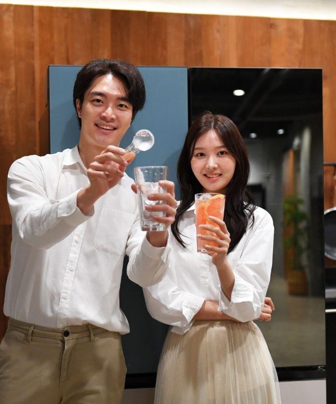 이미지 확대보기LG전자 모델들이 집에서도 호텔 라운지나 카페처럼 칵테일, 아이스커피 등의 음료를 제대로 즐길 수 있는 크래프트 아이스를 소개하고 있다. 사진=LG전자