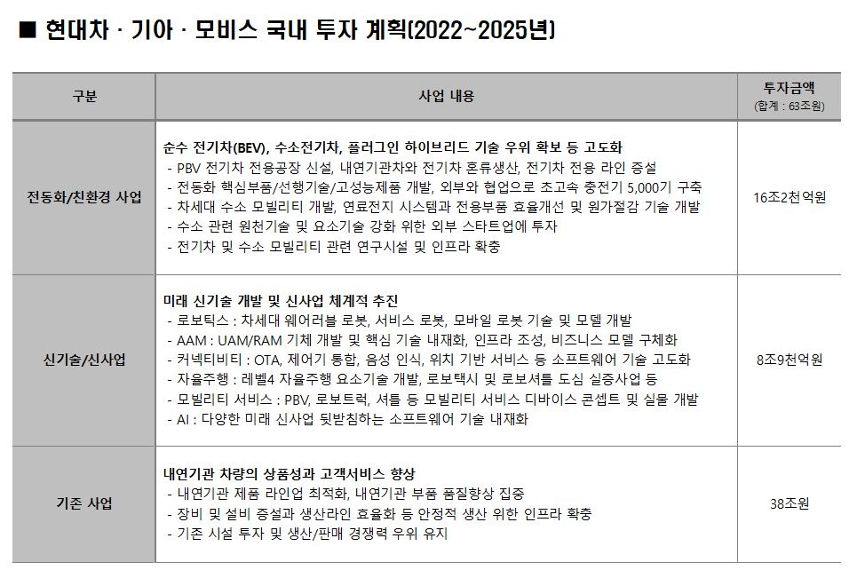 현대차∙기아∙모비스, 2025년까지 국내에만 63조 투자