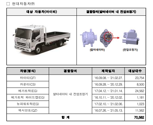 이미지 확대보기현대차에서 제작·판매한 마이티 등 6개 차종 자동차 7만582대와 뉴파워트럭 덤프 등 4개 모델 건설기계 7918대는 한국교통안전공단 자동차안전연구원의 조사에서 제조 불량이 발견됐다.