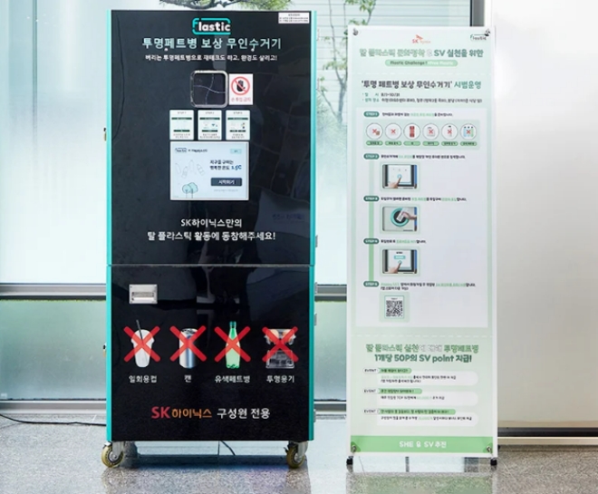 SK하이닉스 뉴스룸에 따르면 지난 1일 투명 페트병 무인수거기가 SK하이닉스의 사업장에 설치되었다. 투명 페트병 무인수거기는 구성원들의 생활 속 SV 실천 및 탈 플라스틱 문화 정착 유도 활동(이하 'Flastic 활동')의 일환으로 SK하이닉스가 SK텔레콤과 협업해 개발했다.