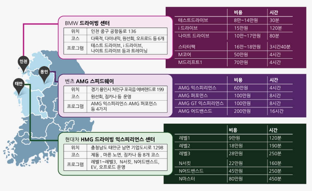 현대차 HMG 드라이빙 익스피리언스 센터는 2시간 30분, BMW 드라이빙 센터는 1시간, 벤츠 AMG 스피드웨이도 차로 1시간 정도면 이동이 가능하다.(서울역 출발 기준).