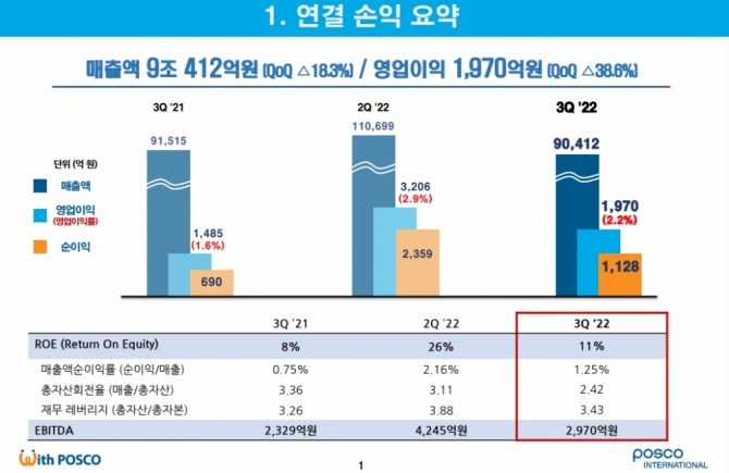이미지 확대보기포스코인터내셔널이 경기 침체에도 불구하고 3분기 호실적으로 거뒀다. 특히 원자재 가격 상승으로 인해 크게 성장한 에너지 부분의 판매량과 수익이 이같은 실적을 이끌었다는 평가다.