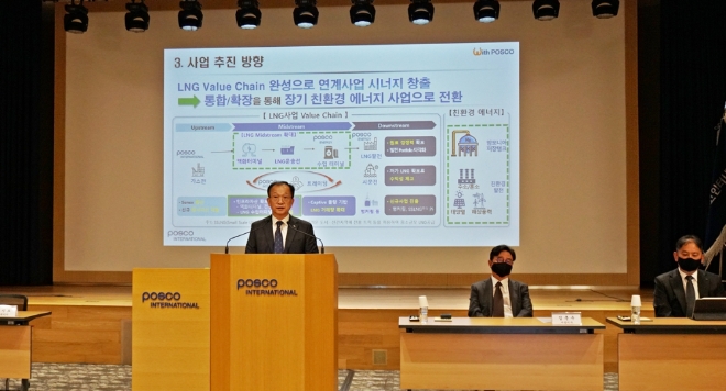 이날 주총에 참석한 주시보 포스코인터내셔널 사장도 이 같은 그룹의 의지를 다시한번 확인시켜줬다. 주 사장은 "그룹 내 에너지 사업을 통합해 LNG사업의 밸류체인을 완성해 지속가능한 성장발판을 마련할 것"이라고 밝혔다. 포스코에너지를 합병해 LNG사업에서의 밸류체인을 완성하고 관련사업을 더 확대하겠다는 의미로 해석된다.