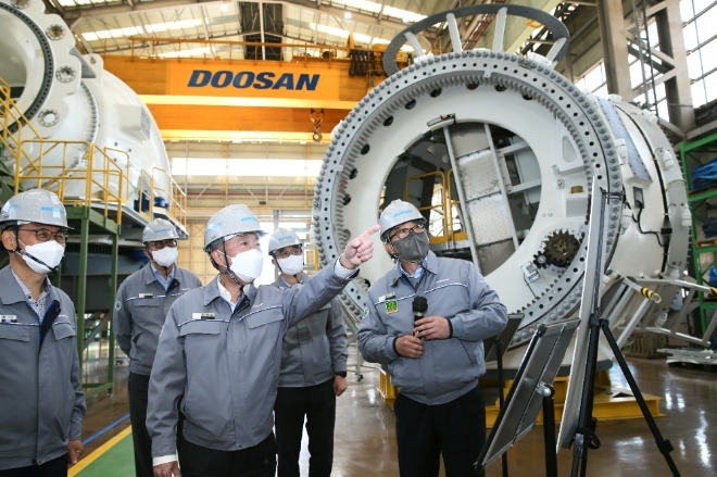 이를 선도하고 있는 기업은 두산에너빌리티다. 두산에너빌리티는 2005년부터 해상풍력 사업을 시작해 현재 3.3MW(메가와트), 5.5MW, 8MW 모델을 보유하고 있다. 지난해 5.5MW급 생산을 위한 풍력2공장 구축, 8MW 생산 공장 조성 준비, 풍력 조직 확대 개편, 차세대 초대형 모델 개발도 계획하는 등 해상풍력 사업을 확대하고 있다. 지난달 15일에는 박정원 두산그룹 회장이 경남 창원시 두산에너빌리티 본사를 방문해 100MW 규모의 제주한림해상풍력에 공급할 5.5MW급 해상풍력발전기 제작 현장을 점검했다.