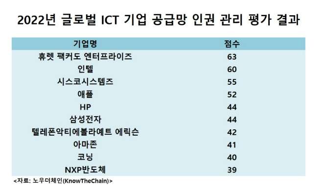 이미지 확대보기국제 비영리기구 ’노우더체인‘(KnowTheChain)은 글로벌 주요 ICT 상장기업 60곳을 대상으로 2022년 공급망 인권 관리를 평가한 결과 삼성전자는 100점 만점에 46점을 받아 HP와 공동 5위를 차지했다고 15일 보도했다.
