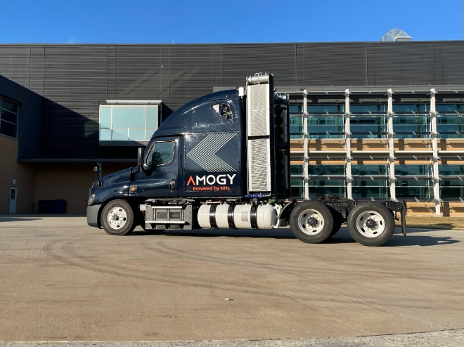 이미지 확대보기SK이노베이션이 투자한 암모니아 기반 수소 연료전지 시스템 전문기업 아모지(Amogy)가 암모니아를 동력원으로 탄소배출 없이 대형트럭을 주행하는데 성공했다.