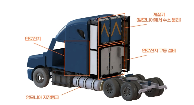 대형차량을 암모니아로 탄소 배출 없이 주행한 건 이번이 처음이다. 8분간 트럭에 완충한 액화 암모니아에서 생성된 전기 에너지 900킬로와트시(kWh)가 수차례의 주행 시험에 쓰였다.