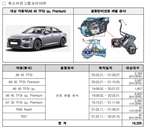 이미지 확대보기우선 아우디 A6 45 TFSI qu. 프리미엄 등 아우디 브랜드 7개 차종 1만8326대가 연료 레벨 센서 불량으로 자발적 리콜에 들어간다. 결함 내용은 연료 레벨 센서가 연료호스 간의 간섭으로 정상 작동되지 않고, 이로 인해 연료가 소모되더라도 계기판에 잔여 연료량이 제대로 표시되지 않을 수 있다.