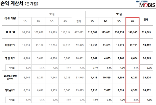 이미지 확대보기현대모비스가 사상 처음 매출액 50조원을 넘어섰다. 전동화 부문 매출도 9조원을 돌파했다. 글로벌 인플레이션과 경기 둔화, 공급망 불안정 등 어려운 상황 속에서 값진 성과를 이뤄낸 것이다. 전동화 부품 등 고부가가치 제품 수주가 실적 상승을 이끌었다는 평가다.