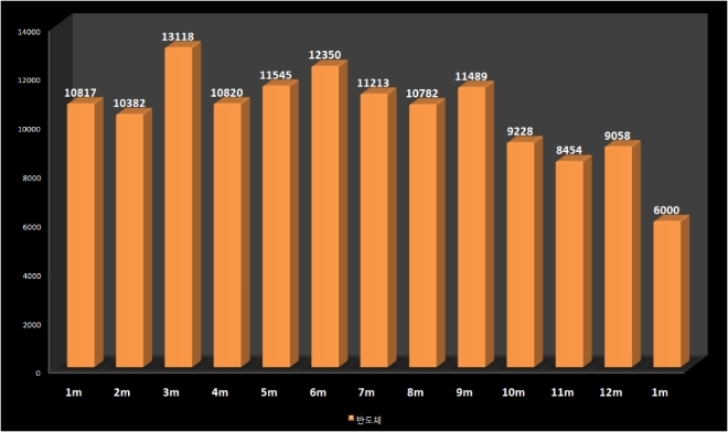 반면 수출품목 1위 제품인 반도체는 부진한 모습이다. 지난해 반도체 수출액은 1292억3000만 달러로 역대 최대치를 경신했지만, 월 수출액이 하반기부터 감소했다. 지난해 8월 이후 수출 감소세가 본격화되면서 다른 업종에 1위 자리마저 위협받을 정도다.