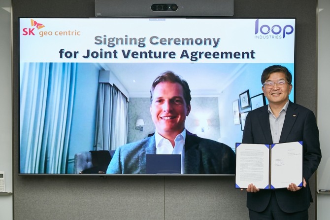 SK지오센트릭은 캐나다의 루프사와 합작법인 설립 계약(JVA)을 체결했다고 3일 밝혔다. 체결식은 나경수 SK지오센트릭 사장, 다니엘 솔로미타(Daniel Solomita) 루프 최고경영자(CEO) 등 양사 관계자가 참석한 가운데 온라인으로 진행됐다.