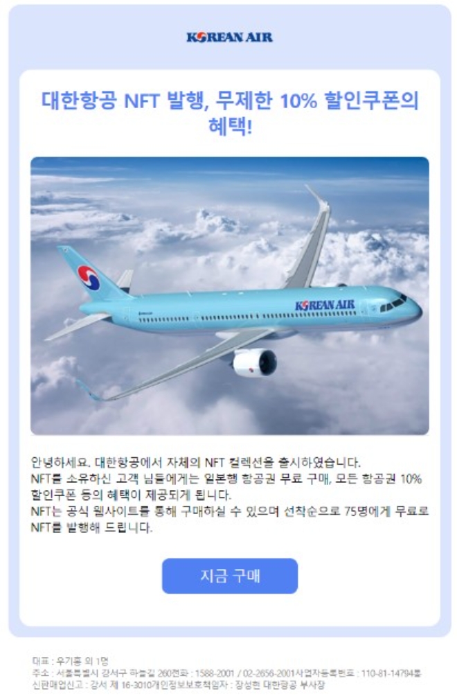 이미지 확대보기11일 관련 업계에 따르면 최근 대한항공 회원을 포함한 불특정 다수의 네티즌에게 '대한항공 NFT 발행, 무제한 10% 할인쿠폰의 혜택!'이라는 제목의 이메일이 발송됐다.