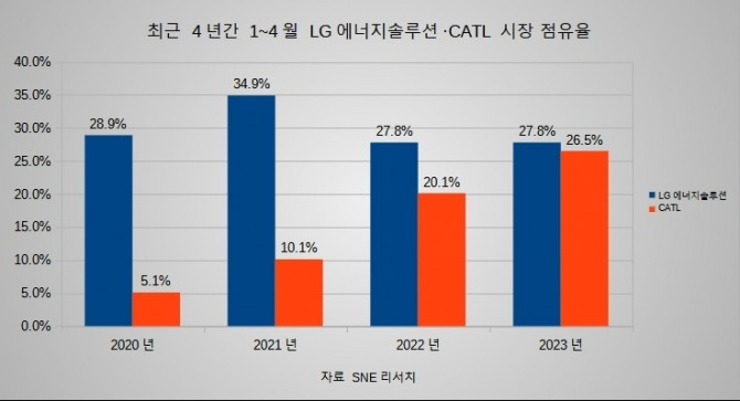 지난 2020년 1~4월 LG에너지솔루션은 배터리 사용량 5.1GWh를 기록하면서 파나소닉에 이은 2위에 올랐다. 같은 기간 CATL은 0.9GWh였다. 시장 점유율도 각각 28.9%와 5.1%로 약 6배 차이가 났다. 하지만 CATL은 2021년 300%, 2022년 100% 성장률을 기록하며 격차를 빠르게 좁혀 왔다. 2021년 기준 양사의 배터리 사용량과 시장 점유율 격차는 각각 9GWh, 24.8%p에 달했지만, 지난해에는 4.4GWh, 7.7%p로 줄었다. 올해는 격차가 이보다 더 좁혀졌다.