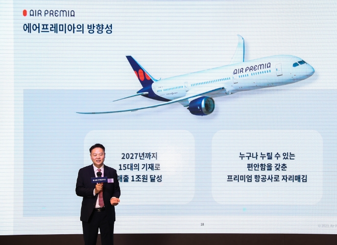 이날 유명섭 에어프레미아 대표는 에어프레미아는 2027년까지 미주·유럽 등 중장거리 노선에 투입할 대형 항공기 15대 이상을 도입하는 한편 매출액 1조1500억원을 달성하겠다고 밝혔다.