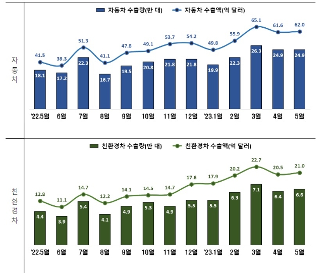 미국 인플레이션 감축법(IRA)의 적용을 받는 친환경차(전기·수소·플러그인하이브리드)의 지난 5월 수출량은 전년 같은 달 대비 49.2% 증가한 6만6264대로 집계됐다. 수출액 기준으로는 전년 같은 달 대비 64.3% 증가한 21억달러였다.