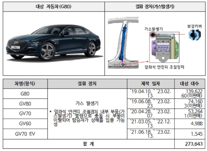 이미지 확대보기현대차 고급 브랜드 제네시스의 준대형 세단 G80과 스포츠유틸리티차(SUV)인 GV80 등 5개 차종 27만6643대는 앞좌석 안전띠 조절장치의 내부 부품(가스발생기) 불량으로 이달 30일 시정조치에 들어간다.