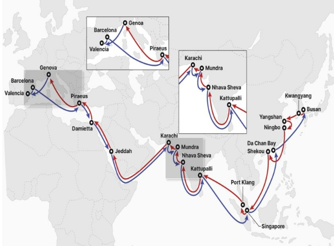 신규 FIM 서비스 기항지는 부산 - 광양 - 상하이 - 닝보 - 셰커우 - 싱가포르 - 포트 클랑(말레이시아) – 카투팔리(인도) - 나바 셰바(인도) - 문드라(인도) - 카라치(파키스탄) – 제다(사우디아라비아) - (수에즈 운하) – 다미에타(이집트) – 피레우스(그리스) – 제노아(이탈리아) – 발렌시아(스페인) – 바르셀로나(스페인) - 피레우스 - 다미에타 - (수에즈 운하) - 제다 – 카라치 – 문드라 – 나바 셰바 – 카투팔리 – 싱가포르 – 다찬 베이 – 부산 순이다.