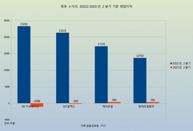 특히 사업 부문 중 정유 사업이 크게 부진했다. 정유만 따로 두고 보면 이들의 합산 영업손실은 1조346억원에 달했다. 기업별로 살펴보면 SK이노베이션에서 정유 사업을 담당하는 SK에너지가 -4112억원, GS칼텍스가 -2348억원, 에쓰오일이 -2921억원, HD현대오일뱅크가 -965억원이었다.