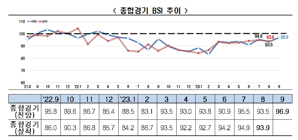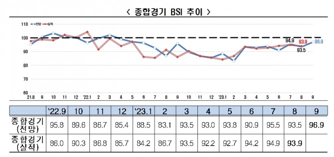 이미지 확대보기전국경제인연합회(이하 전경련)는 매출액 기준 600대 기업을 대상으로 기업경기실사지수(Business Survey Index)를 조사한 결과, 9월 BSI 전망치는 96.9를 기록했다고 21일 밝혔다. 응답률은 60%였다.